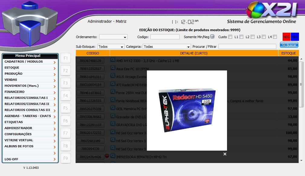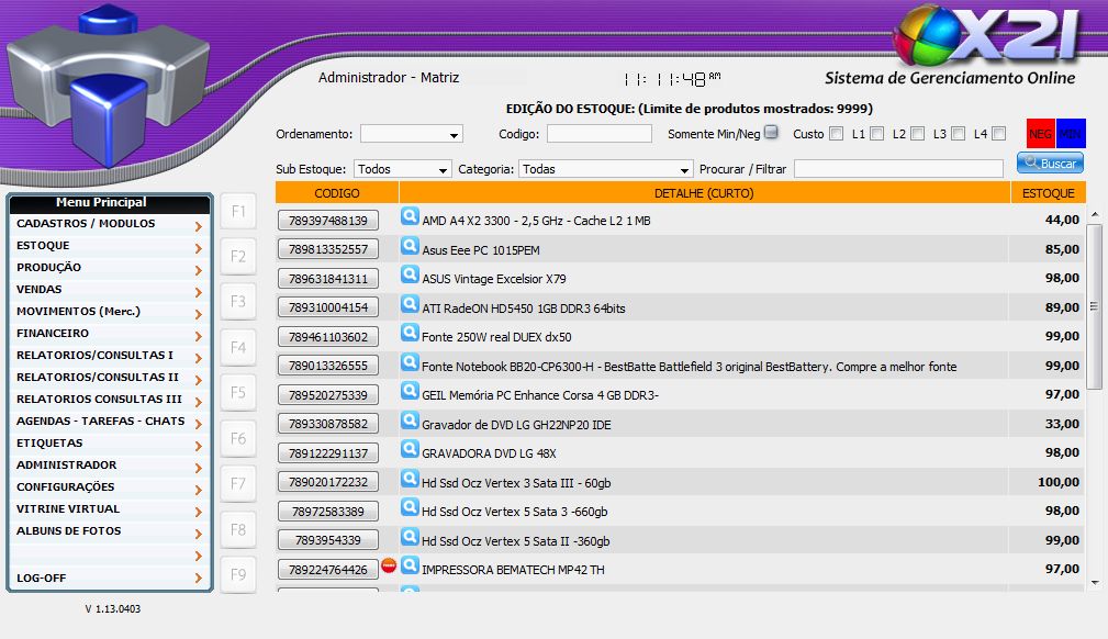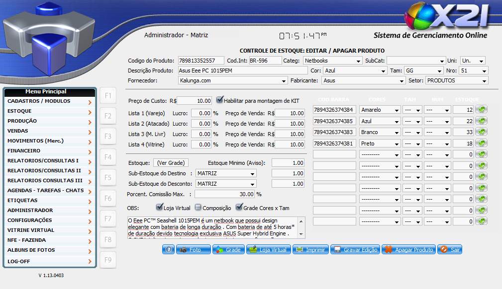 4 listas de preço diferentes, estoque mínimo, grade de cores e tamanhos, inclusão na vitrine virtual, com fotos e videos.
